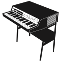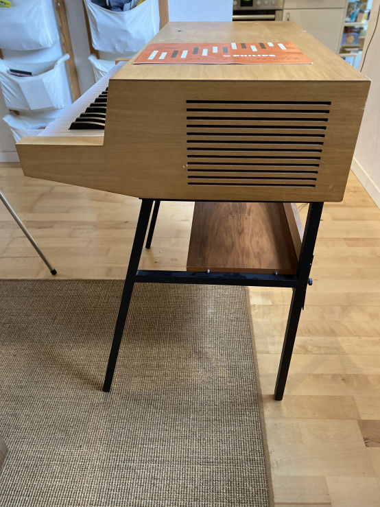49 Tasten, eingebauter Verstärker und Lautsprecher. Hall und Vibrato Effekt. Massives Holzgehäuse. Metall-Ständer.
